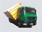 Трехосный автомобиль-самосвал для перевозки зерна МАЗ-650108-225-000 с разгрузкой платформы на правую сторону. Предназначен для перевозки зерна и других сыпучих легковесных грузов в составе автопоездов с трехосным прицепом